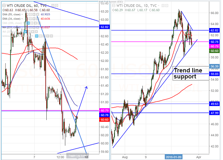 - US oil shown a minor recovery after hitting low of $59.94. The commodity has taken support near trend line and shown a minor jump and is currently trading around $60.65.