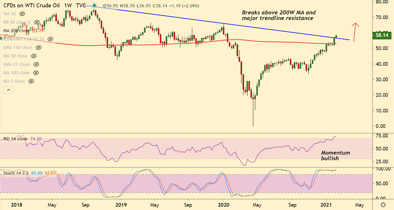 Price action has shown a decisive break above 200W MA and major trendline resistance at 57 mark adding support to the bullish bias.