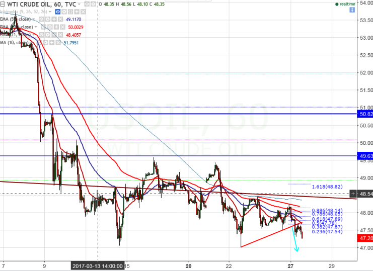 - US Oil breaks trend line support at $47.65 and declined till $47.37. It is currently trading around $47.41.