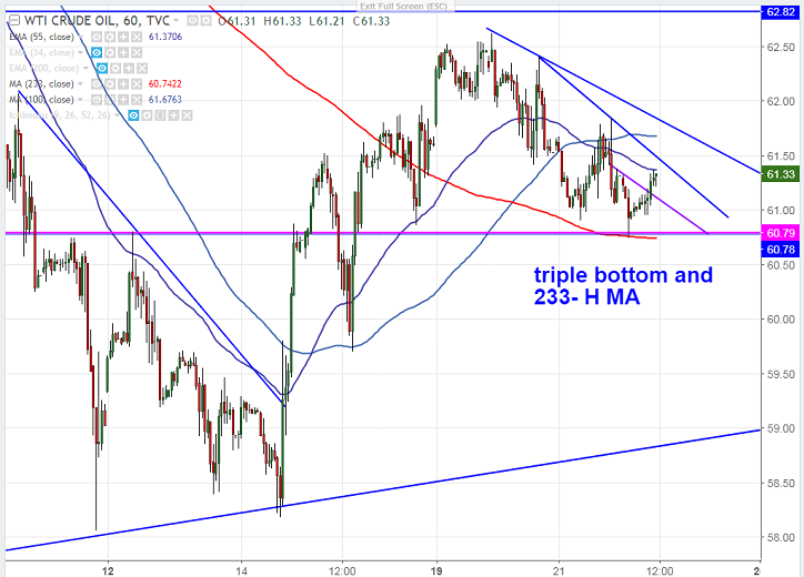 - The near term intraday resistance is around $61.37 (55- H MA) and any break above will take the commodity till 61.84 yesterday’s high/$62.50.