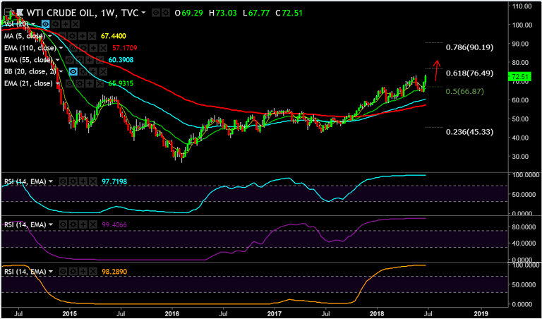 Recommendation: Book partial profits at highs, stay long for 74.70/ 75/ 76.49