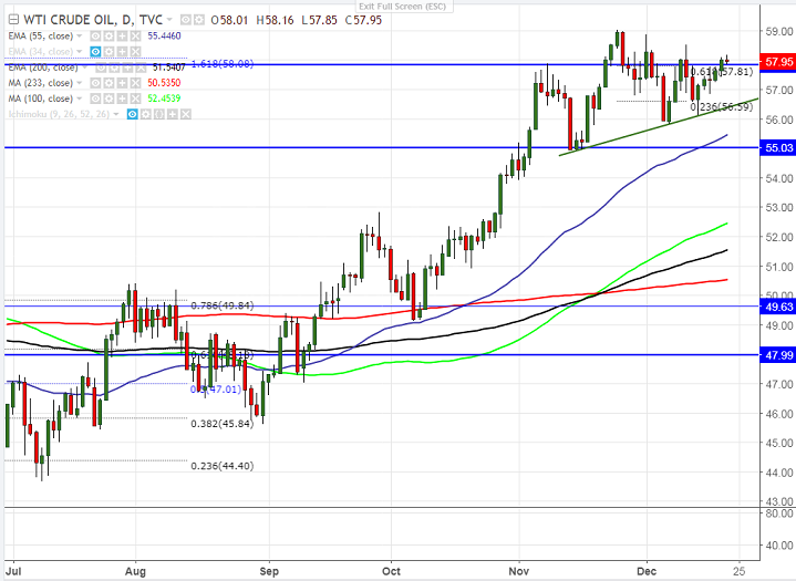 - Technically, the pair broken 61.8% retracement of $59.02 and $55.84 at $57.81 and any break above will take the commodity to next level till $59.02. It should break above $59.02 for major trend reversal.