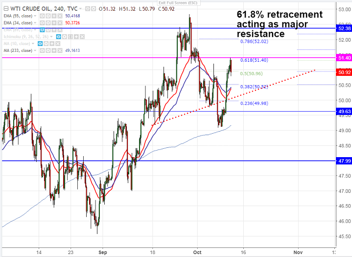 - US Oil recovered till 61.8% retracement of $52.83 and $49.11 at $51.40 and started to decline. Any further bullishness can be seen only above $51.40 and break above will take the pair to next level till $52/$52.83.Overall bullish continuation only above $52.83.