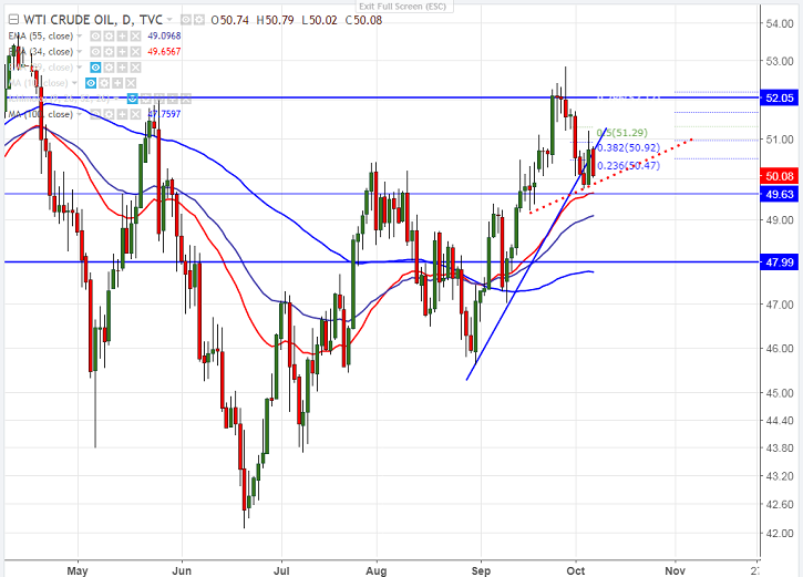 - WTI crude oil has shown a huge jump yesterday after hitting a low of $49.75 as Saudi Arabia and Russia would limit production in next year. But declined sharply from the high of $51.20 level till $50.05.
