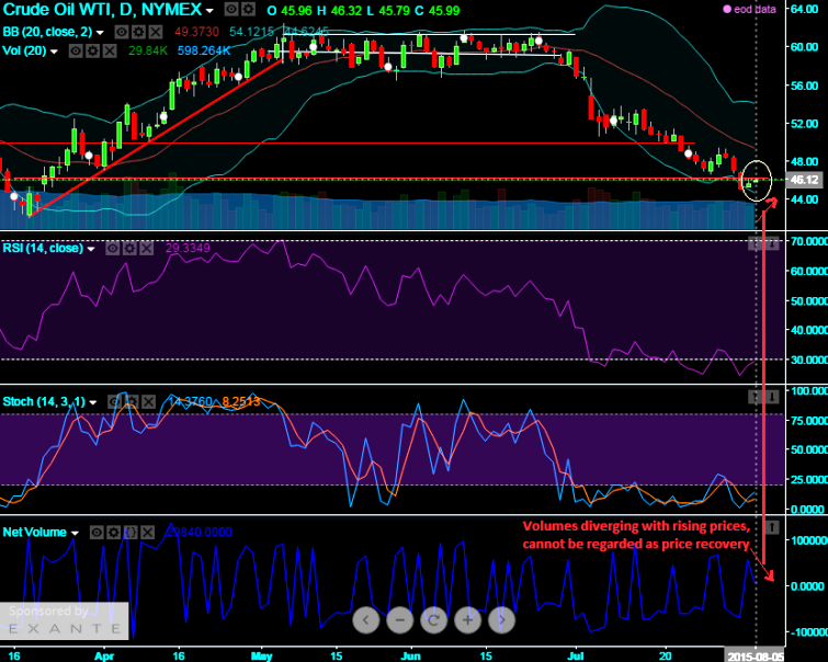 As shown in the diagram we think crude futures is taking resistance at 46.41 levels with unconvincing volumes which means buying interest at this level is not seen (supply is more than demand), so any breach above 46.41 levels on closing basis along with substantial volume confirmation may provide little strength in short run, otherwise we've been firm on our earlier targets 42.22 levels in medium trend.