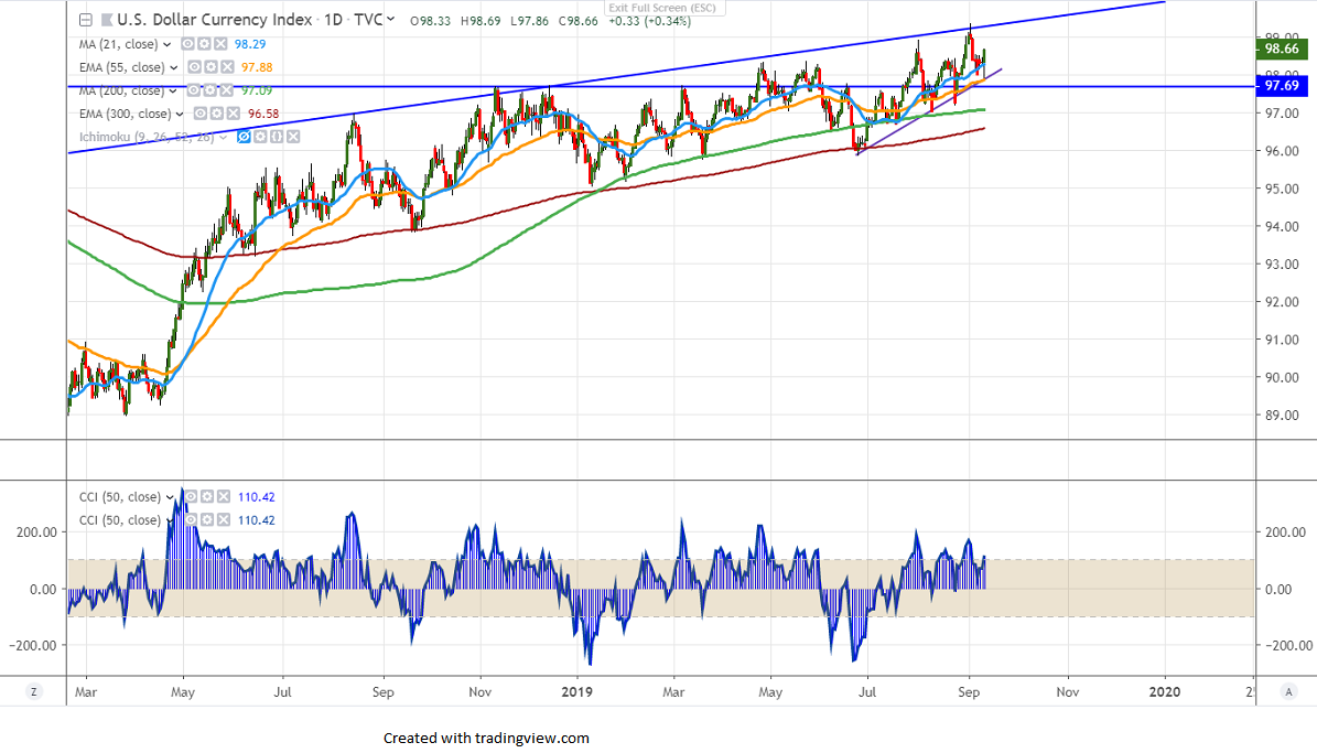 The near term resistance is around 99 and any break above will take the index to high 99.35 made on Sep 3rd, 2019. The bullish continuation can be seen only above 99.35.