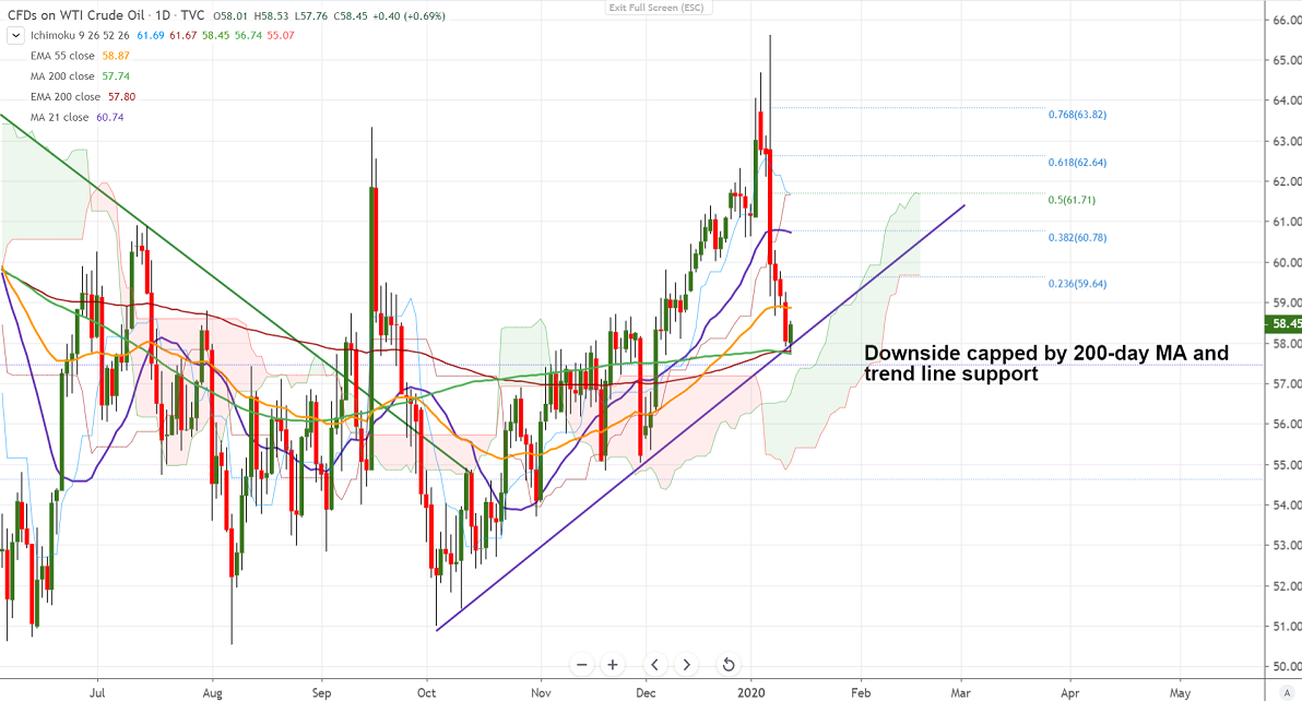 US Oil recovered slightly after the decline of more than 10% from temporary top $65.72 formed on Jan 8th, 2020. The jump mainly came on US-Iran geopolitical escalation but slight easing has dragged the oil prices sharply till $57.76. It is currently trading around $58.45.