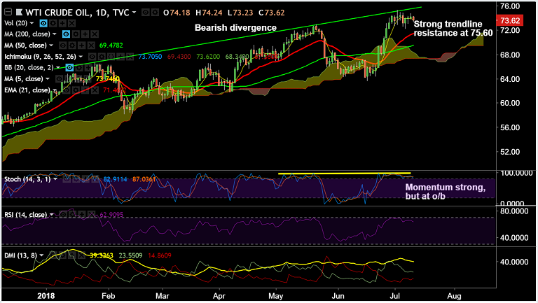 Resistance levels - 73.75 (5-DMA), 74, 75, 75.60 (trendline)