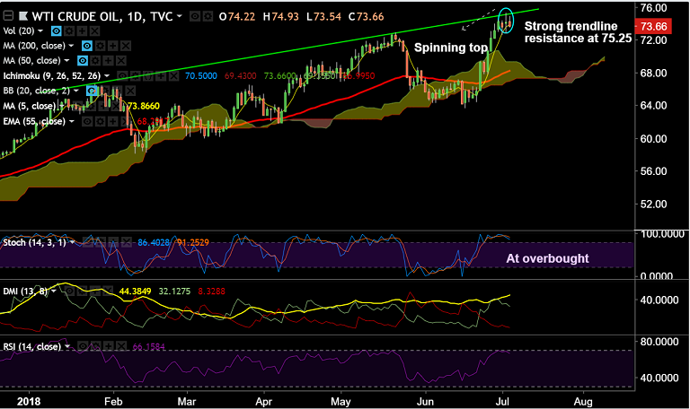 - US oil pauses upside at major trendline resistance at 75.25, slips below 74 levels.