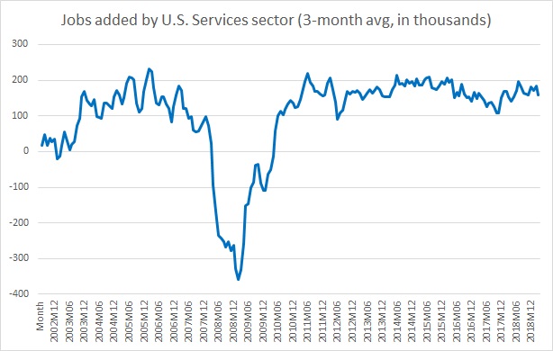 The above chart shows the three months average of numbers of jobs added to the economy by the services sector, which has been the main job provider in the United States since manufacturing started faltering back in 2001. And it clearly shows that the slowdown is prominent.