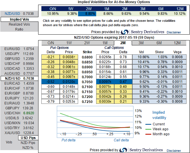 NZDUSD’s medium term perspective: Potential for higher to the 0.7150-0.7300 area during the month ahead, as USD longs are pared. Further out, the Fed’s tightening cycle plus US fiscal expansion should maintain upside pressure on US interest rates and the US dollar, pushing NZDUSD down towards 0.6900 or lower. Weaker dairy prices plus the RBNZ’s emphatic reminders it is on hold for a long time should also weigh.