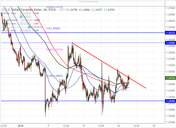 - USD/CAD has shown a minor jump after forming a temporary bottom at 1.23622. The major data for further movement of Canadian dollar is due to NAFTA talks. The pair jumped till 1.2508 and is currently trading around 1.24852.