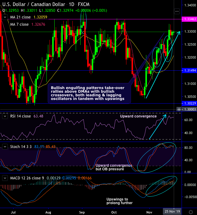 Bullish engulfing patterns at 1.3225 and 1.3265 levels take-over rallies above DMAs with bullish crossovers (refer daily chart), while both leading and lagging oscillators are in tandem with the upswings.