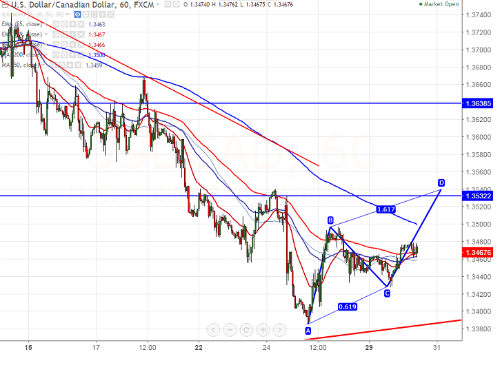 - USD/CAD formed a min or bottom around 1.3387 and shown a minor jump from that level. The pair formed a potential bearish AB=CD pattern and is expected to get completed at 1.35390 level. Short-term trend is slightly bullish as long as resistance 1.3560 (200 4H EMA) holds. It is currently trading around 1.34687.