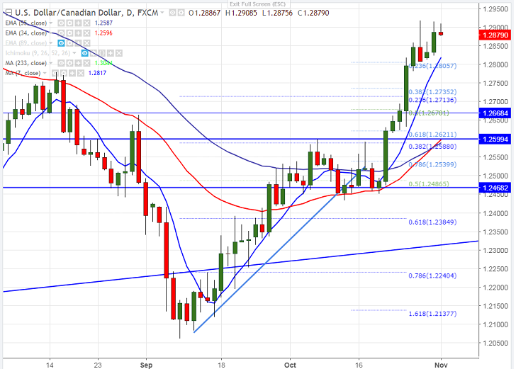 - USD/CAD hits three and half month high yesterday after weaker than expected Canada GDP data. Canada’s GDP declined unexpectedly in Aug by 0.1% month-over –month compared to forecast of 0.1%. The pair hits high of 1.29147 and declined slightly on profit booking. It is currently trading around 1.28820.
