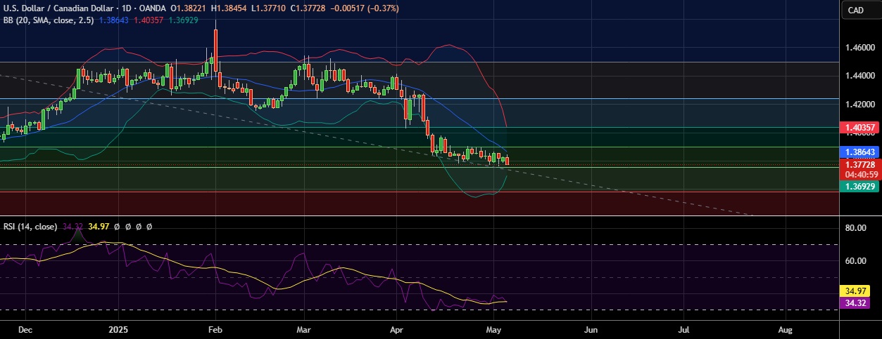 • Support is seen at 1.3755(38.2%fib) and break below could take the pair towards 1.36968(Lower BB).