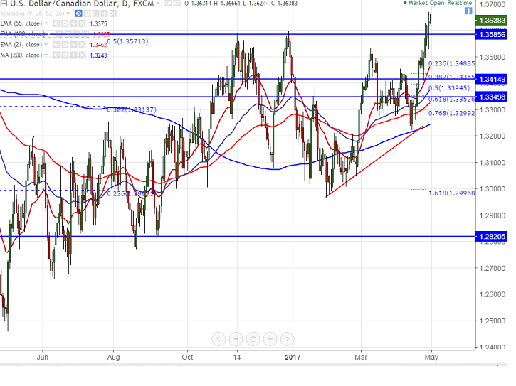 - On the lower side, major near term support is around 1.3410 and any break below will drag the pair down till 1.3310 (100- EMA)/1.3220 (Apr 13th 2017 low). The minor support is around 1.3480.
