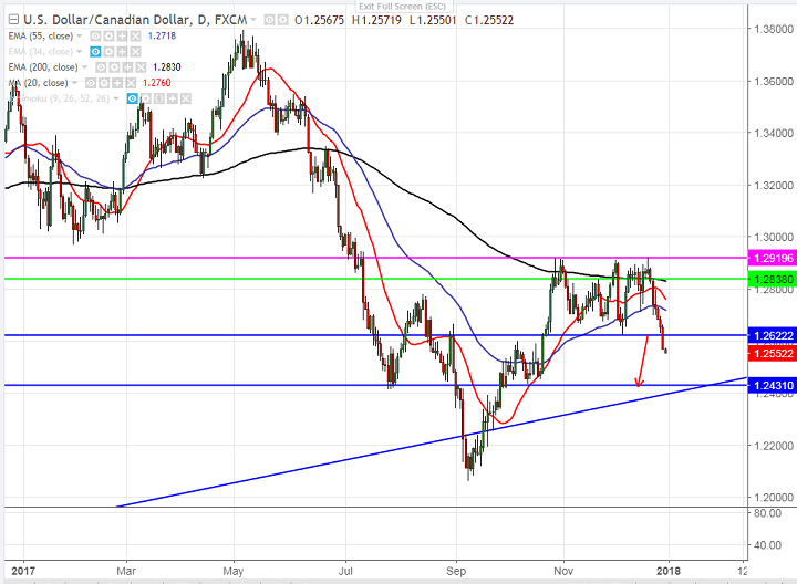 - USD/CAD has declined sharply after breaking major support at 1.2600. The pair hits low of 1.2550 and is currently trading around 1.2555. The main reason for the rally in Canadian dollar is due to strong jump in crude oil price. US oil prices hits 2-1/2 year high at $59.98 and is consolidating around that level. The pair is currently trading around 1.2550.
