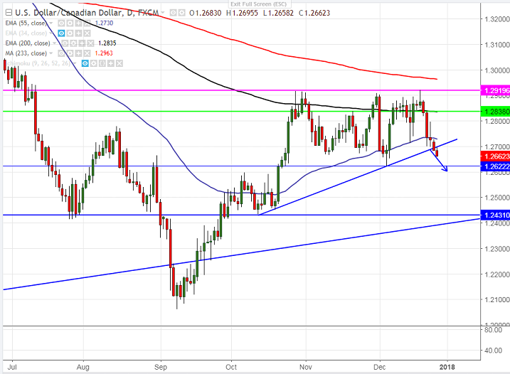- USD/CAD broken major trend line support at 1.26950 and declined till 1.2660 at the time of writing as US oil prices hits 2-1/2 year high. The pair dipped almost 40 pips from the intraday high and is currently trading around 1.26593.