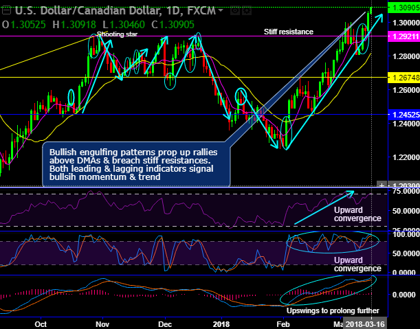 Chart and candlestick patterns: Frequent occurrence of bullish engulfing patterns pop up at 1.2963 and 1.3087 levels and these bullish patterns prop up rallies well above DMAs and EMAs. In this process of upswings, the bulls manage to break-out the stiff resistances of 1.2920 levels and establish 8 and a half months highs (refer both daily and weekly chart).