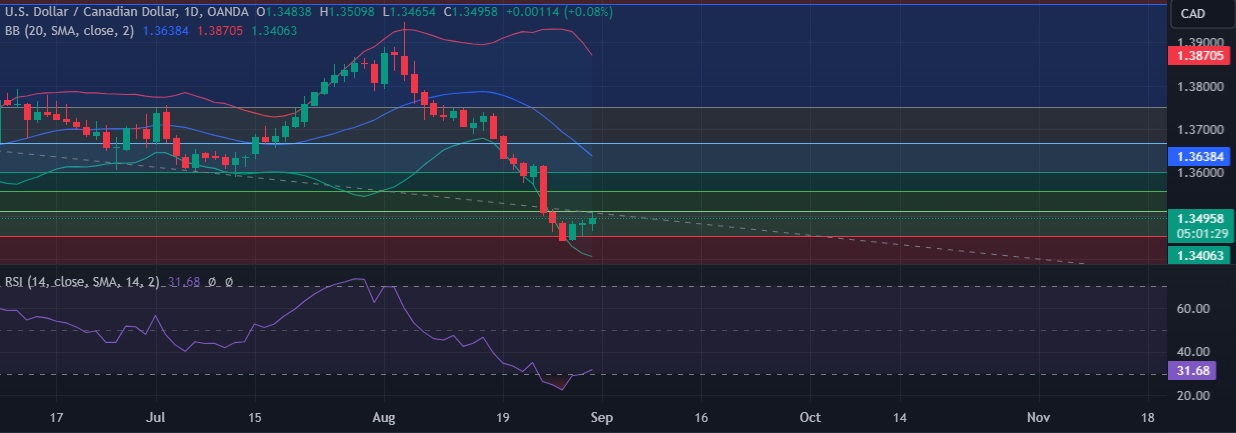 • Support is seen at 1.3450 (23.6%fib) and break below could take the pair towards 1.3424(Lower BB).