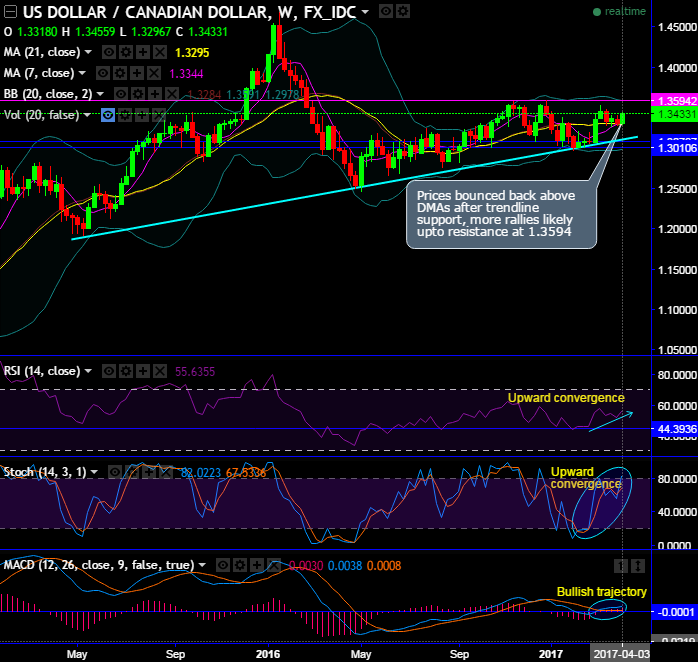 The current prices have bounced back above DMAs after trendline support, more rallies likely upto resistance at 1.3594 levels, while 7WMA is most likely to crossover 21WMA which is the bullish crossover.