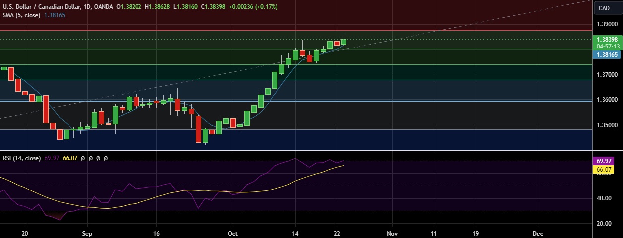 • Support is seen at 1.3816(5DMA) and break below could take the pair towards 1.3801 (50%fib).