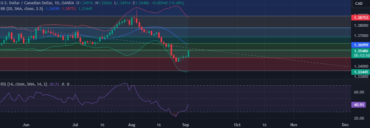 • Support is seen at 1.3484(23.6%fib) and break below could take the pair towards 1.3449(August 28th low).