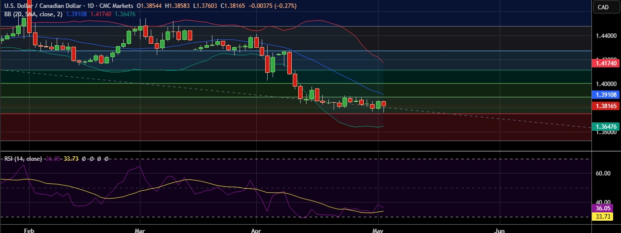 • Support is seen at 1.3757(23.6%fib) and break below could take the pair towards 1.3650(Lower BB).