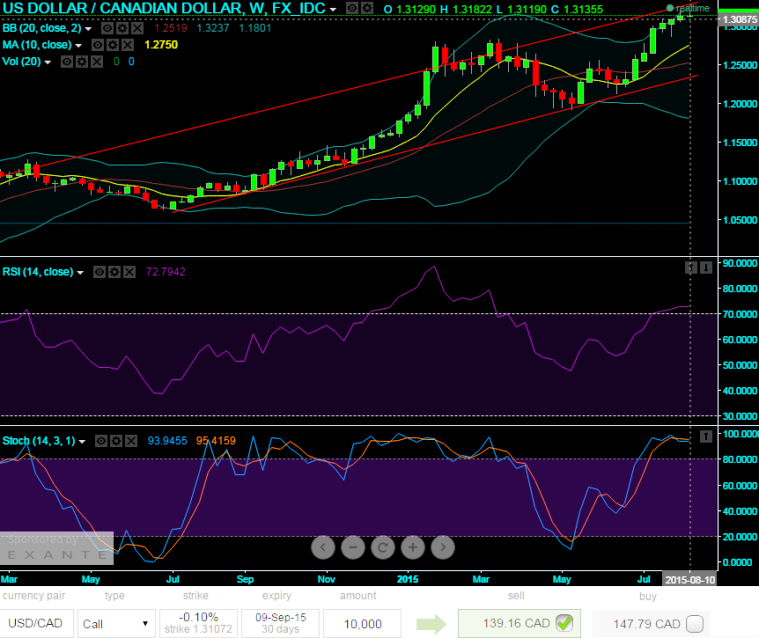 USD/CAD is currently trading at 1.3136 levels which is likely heading towards trend line resistance at around 1.3268 levels. So if options trader decides to write September month 1.3107 covered call for C$139.16 and simultaneously to buy USD10000 at spot FX by paying 13118 and receives C$139.16 in premium giving a net investment of $12978.84.