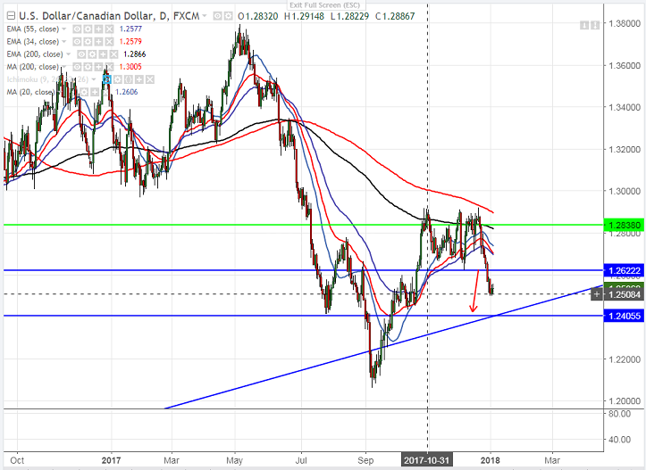 - CAD outperformed USD and enjoyed more than 7% rally in 2017. USD/CAD declined sharply after forming temporary top around 1.29202 on Dec 19th 2017. The main reason for the rally in Canadian dollar is due to good jump in oil price. The pair hits low of 1.25000 and is currently trading around 1.25239.