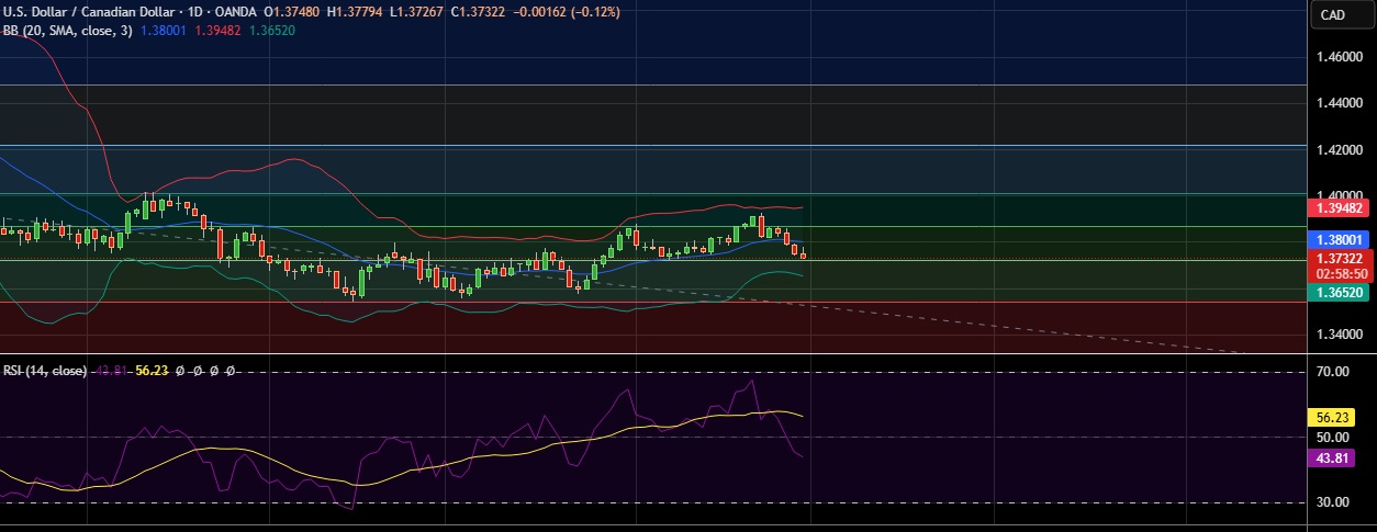 • Support is seen at 1.3735 (38.2%fib) and break below could take the pair towards 1.3659(Lower BB).