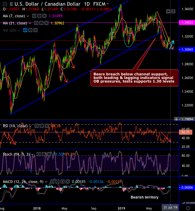 Technical Chart and Candlestick Patterns: USDCAD minor trend breached ascending channel support, consequently, slide way below DMAs. Currently, testing supports at 1.30 levels.