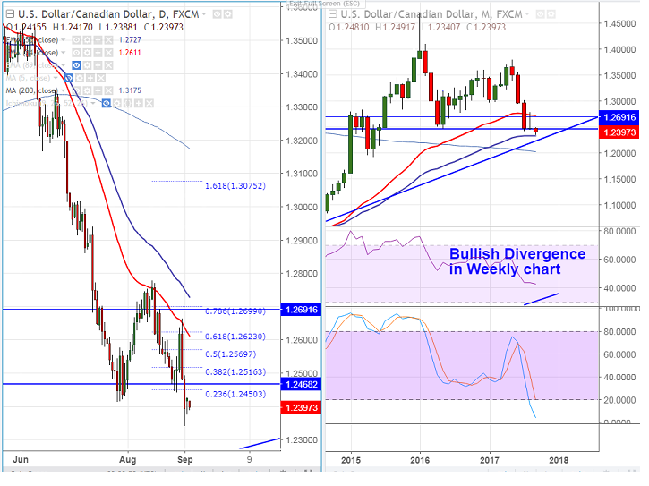 - USD/CAD has formed a minor bottom around 1.23405 and jumped slightly from that level. The pair has jumped till 1.24261 and is currently trading around 1.23965.