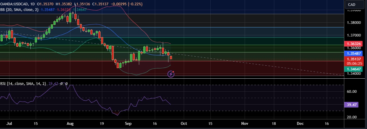 • Support is seen at 1.3499(23.6%fib) and break below could take the pair towards 1.3465(Lower BB).