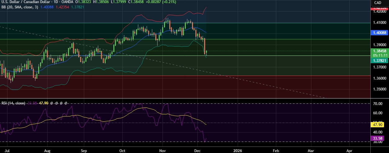 • USD/CAD has seen a 1.3852-1.3800 range on Monday, chart points to a drop towards 1.3750 level.