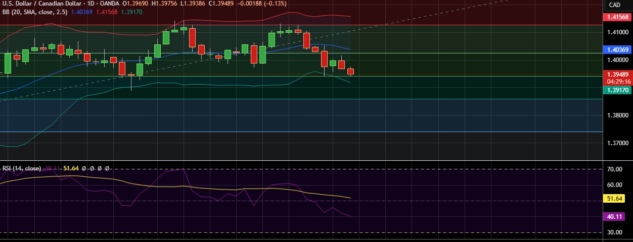 • Support is seen at 1.3959(50%fb) and break below could take the pair towards 1.337(Lower BB).