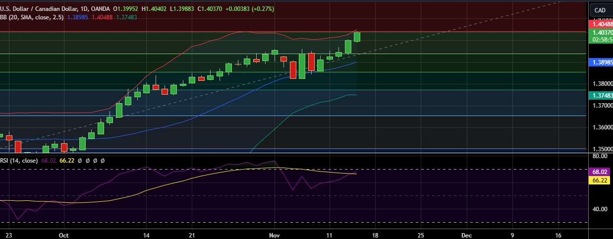 • Support is seen at 1.3988(Daily low) and break below could take the pair towards 1.3937( (38.2%fib).