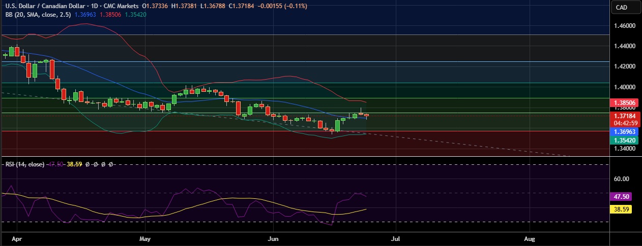 • USD/CAD slipped lower on Tuesday as greenback weakened after Middle East tensions eased following a ceasefire agreement between Israel and Iran.