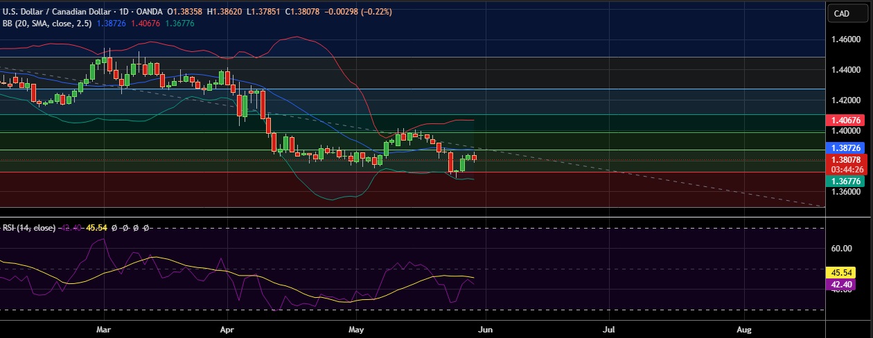 • Support is seen at 1.3723 (23.6%fib) and break below could take the pair towards 1.3677(Lower BB).