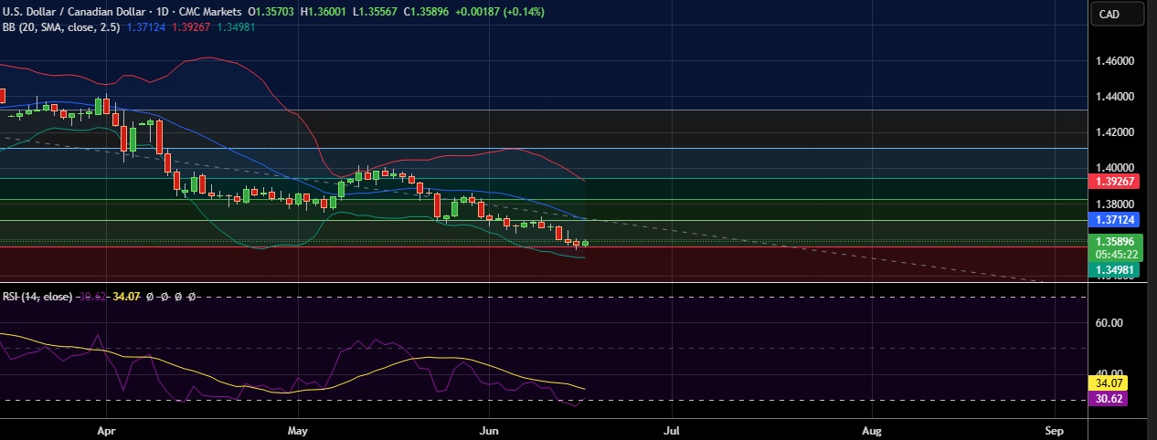 • Support is seen at 1.3555(23.6%fib) and breakbelow could take the pair towards 1.3499(Lower BB).