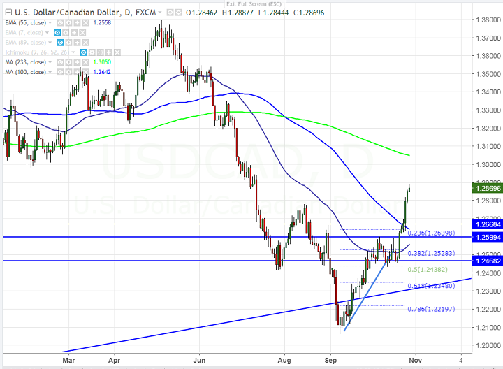 - Canadian Dollar tumbled sharply yesterday after dovish Bank of Canada. Loonie has broken 1.28576 high made yesterday and jumped till 1.28877 and is currently trading around 1.2867.