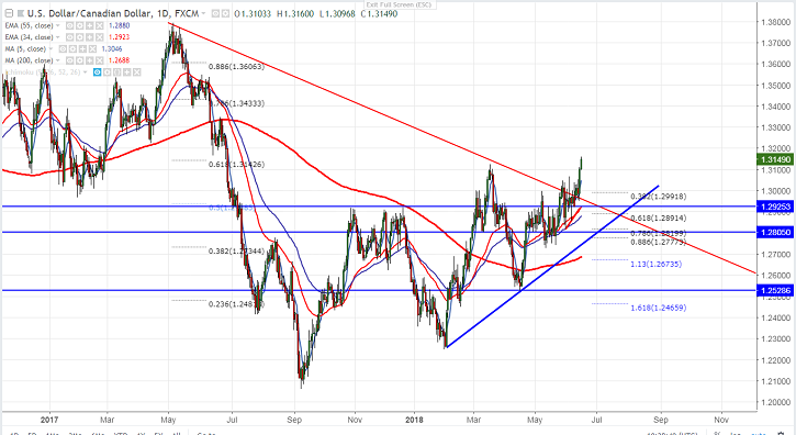 - USD/CAD is trading higher yesterday after sharp pull back in dollar against all majors. It hits 3- month high at 1.31536. US fed hiked interest rates and was more hawkish than expected. The dot plot shows more than 3 rate hikes this year. The Canadian dollar was trading weak this week as US and Canada trade war intensifies. Trade war fears and death of NAFTA are the main issues dragging Canadian dollar. The pair hits intraday high of 1.30516 yesterday and is currently trading around 1.3150.