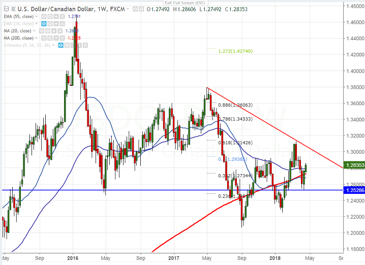 - USD/CAD continuing its bullishness for 2nd week and has jumped almost 100 pips in this week. It has jumped more than 300 pips from temporary bottom of 1.25275 made on Apr 17th 2018. Loonie jumped mainly due to weak economic data and dovish comment by BOC Governor Poloz. The pair hits high of 1.28606 and is currently trading around 1.28356.