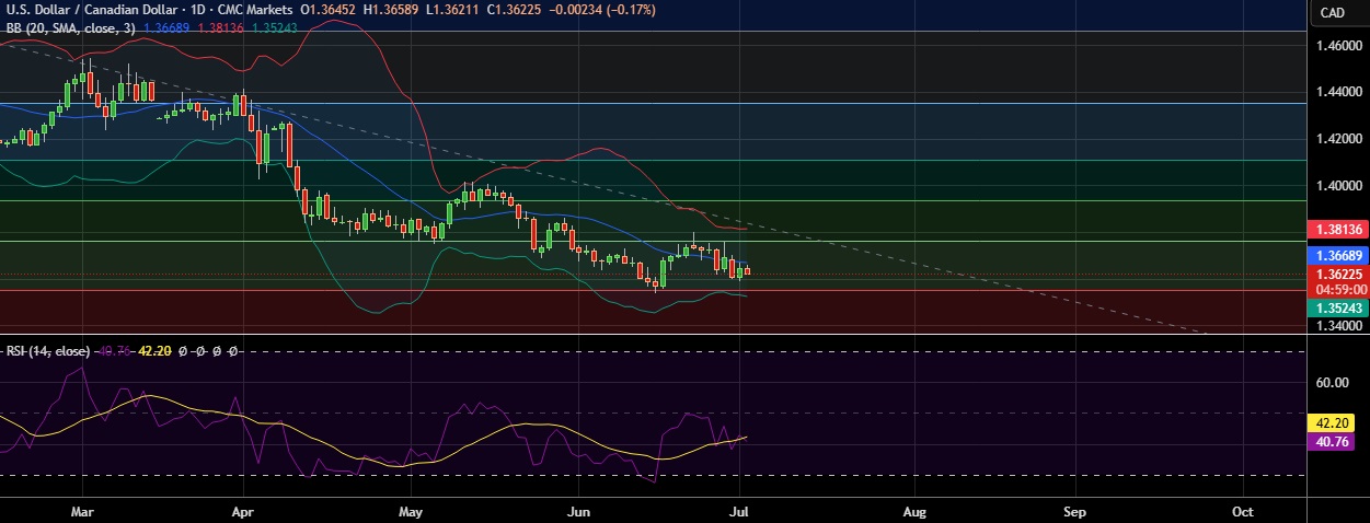 • USD/CAD edged lower as investors assessed weaker-than-expected domestic and U.S. economic data while monitoring developments in trade talks ahead of President Trump’s July 9 tariff deadline.