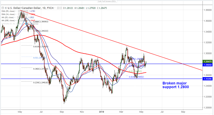 - USD/CAD has shown nice recovery of almost 100 pips form low of 1.27289 made on Friday. A slight weaker than expected Canadian jobs data has dragged the Canadian dollar down from three week high. Canada jobless rate stable at 5.8% in line with forecasts and employment number contracted by 1100compared with an increase of 16000. Loonie hits low of 1.28340 at the time of writing and is currently trading around 1.28450.