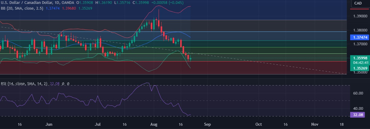 • Support is seen at 1.3575(23.6%fib) and break below could take the pair towards 1.3552(Lower BB).