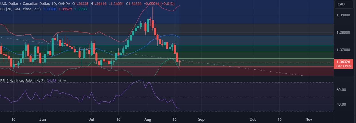 • Support is seen at 1.3604 (23.6%fib) and break below could take the pair towards 1.3588 (Lower BB).