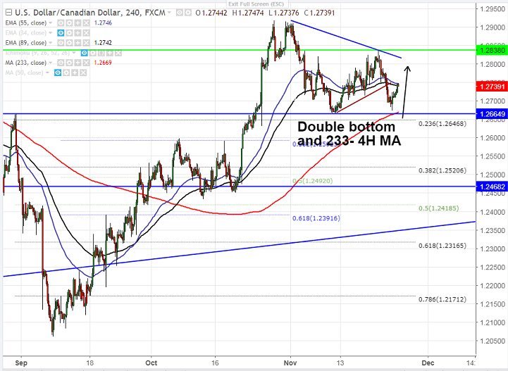 - USD/CAD has recovered sharply after a weaker than expected Canadian economic data. The pair hits tow week low after dovish FOMC minutes meeting and strong crude oil prices. The pair declined till 1.26728 after Fed minutes showed concerns over weak inflation .The rate hike in Dec is confirmed but there are growing doubts over three more hikes in 2018. US dollar index broken major support at 93.40 (50- day MA) and dipped till 93.10 at the time of writing.