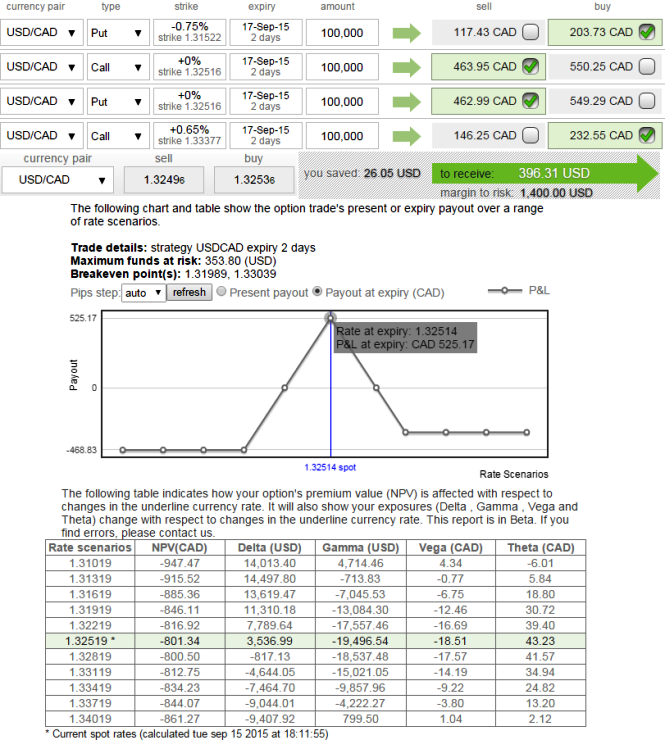 Iron Butterfly (USD/CAD) = Long 2D (0.75%) OTM -0.25 delta Put (strike at around 1.3155) & Short ATM Put + Short ATM Call & Long 2D (0.65%) OTM 0.25 delta call (strike at around 1.3325)